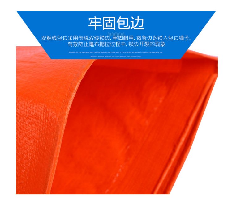 雙桔色PE防水篷布牢固包邊,雙粗線包邊采用傳統(tǒng)雙線鎖邊,牢固耐用,每條邊均鎖入包邊繩子,有效防止篷布拖拉過程中鎖邊開裂的現(xiàn)象